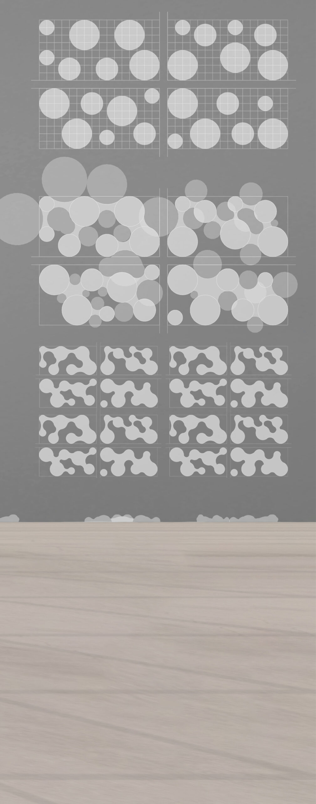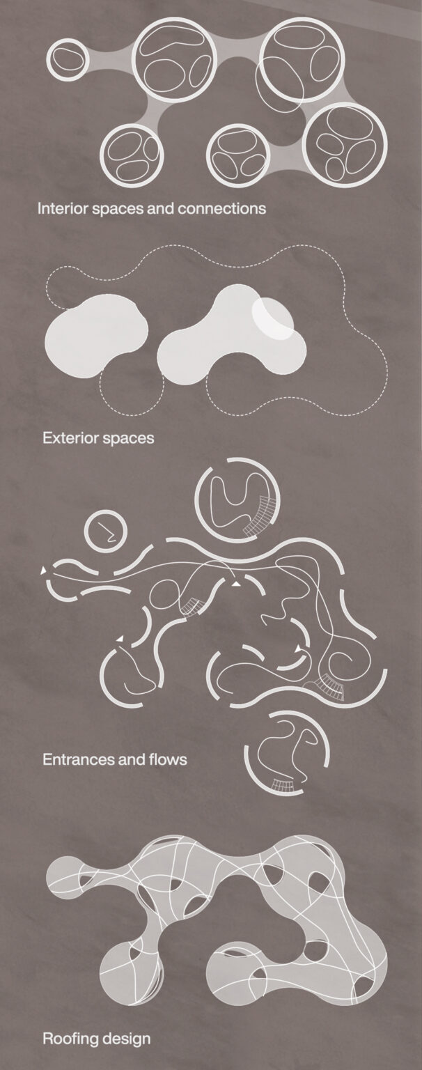 La configurazione base all’interno del lotto a disposizione è composta da alcune particelle più grandi che racchiudono delle funzioni ben precise, scelte in base alle esigenze del nucleo familiare, collegate da corridoi interstiziali che costituiscono un momento di pausa e di riflessione prima di raggiungere un’altra stanza e, quindi, un’altra attività.
