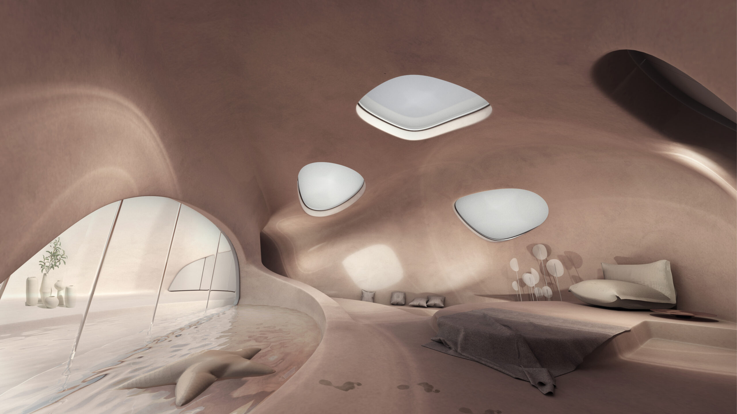 Spazi in grado di mantenere la privacy richiesta, fluendo tra interno ed esterno in maniera consapevole. Gli interni si plasmano a seconda dei tre elementi primordiali dell’uomo come l’aria, l’acqua e il fuoco, connettendo la casa alle fonti fondamentali della vita umana.